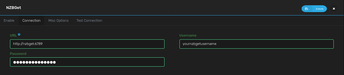 • For "Username" / "Password": fill in your NZBGet login (see [NZBGet|Install: NZBGet#2-setup])